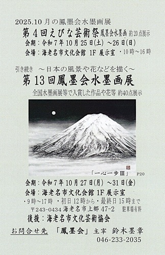 | 2025年 ・5月28日〜6月4日 第37回全日中展 上野 東京都美術館 18点出品、 準大賞、参議院議長賞等 全員入賞でした。 ・8月7日〜16日 第8回日美展 国立新美術館 生徒1点出品。 準大賞のお知らせが来ました。 ・10月は,25日・26日 海老名芸術祭参加 約20点出品予定 続いて27日〜31日 第13回鳳墨会水墨画展 (約40点展示) 開催が決定しました。 上記案内のとおり 開催場所は、いずれも 海老名市民文化会館 1F展示室 ・11月 第25回現代の創造展出品予定。 長野県飯田市美術博物館 ・12月 第32回雪舟国際美術協会展、国立新美術館 出品予定 |
