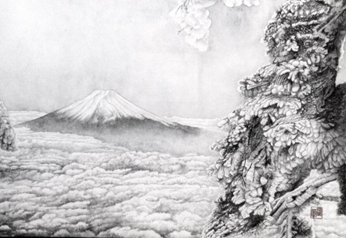 迎 春 平成5年 (1993年) F15号(62.0cm×53.0cm) 富士山・雲・樹氷を描きたくて,大菩薩峠から富士山を少し大きくして描いたものです。 雲がなかなか難しく大変勉強になった。 第十回鳳墨会水墨画展(平成6年) |
