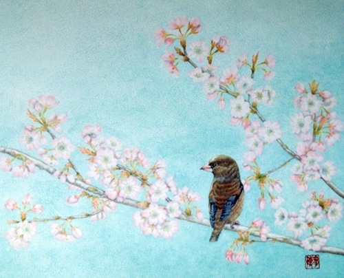 桜にシメ 平成3年 (1991年) F8号( 45.5cm×37.9cm) この絵も,上記の手法で描いたものです。 鳥の羽,桜の花びら,空が大変でした, 第八回 鳳墨会水墨画展(平成4年) 初出品 努力賞 |