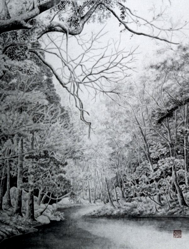 静 思 平成4年 (1992年) F10号(53.0cm×45.5cm) 水墨画を始めてから4年,先生独自の手法である淡墨を重ねて,陰影を表現していき白い部分を残して描く,塗り込み手法で始めて描いた,静かな奥入瀬の景色です。 第九回鳳墨会水墨画展(平成5年) |