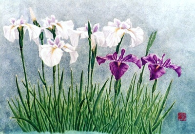 菖 蒲 平成6年 (1994年) F8号(45.5cm×37.9cm) 港北ヒュータウンの仲町台駅近くのお寺で,住職の奥さんが育てている白と紫の菖蒲を,プロ級の写真家小島晴光さんが撮ったものを描いてみました。 白い花びらや茎や葉の描き方が大変勉強になった。 |