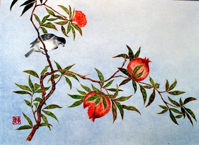 ザクロ 平成3年 (1991年) F8号(45.5cm×37.9cm) 水墨画は,一番始め一筆書きで和画仙紙に横に一を描くことから始まり,縦の線・丸・曲線…と進み,竹・木・野菜・果物・草花・魚・鳥・昆虫等を一通り習い,それから山水画を習います。 その後,麻紙や本画仙紙に書くための滲み止めのドーサ引きや顔彩の使い方,淡墨の重ね方等を習うために,自分でドーサを引いた麻紙に顔彩で花鳥を描きます。 この絵は,麻紙に鹿膠と明礬を使ってドーサを引いて,顔彩を淡彩し,数回重ねて塗り込んでいく「塗り込み」という描き方で始めて描いたものです。 完成までには半年かかりました。 |