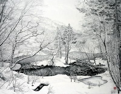 磐梯は、以前、3月の下旬に水墨画の仲間数人で行き、雪の中をかんじきを履いて、くまなく歩きました。