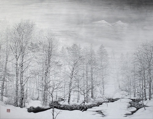 「靄然神気」 平成23年(2011年) F50(116.7cm×91.0cm) 3月末の裏磐梯は、春雪の季節、夕方には雪が降り、朝は朝靄が立ち込め冷えがやわらぐ。 そんな中、足跡もない春雪を踏んで出かけると、朝日が上がると共に靄がすーっと薄くなってゆく、そこに何かがいるように、そんな神秘の光景に魅せられた。 3月の裏磐梯は、正に水墨の世界だ。 第15回全日中展日中交流展 大 賞 |