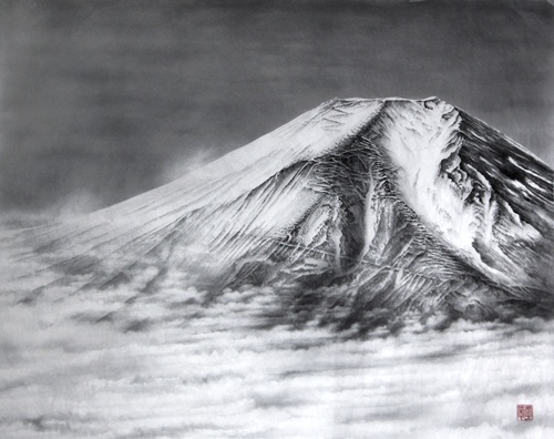 「一心一歩」 平成24年(2012年) F30(91.0cm×72.7cm) 以前、夜12時に5合目から昇り始め、朝4時20分富士山頂でご来光を拝んだ。九十九折りの山道は、登っても登っても7合目、8合目、やっとの9合目も多く、見える山頂の明かりも近くにならない。兎に角、一心不乱に一歩一歩登る、時々月明かりの壮大な雲海を見て元気を得、無心に前進。今も富士山を眺めると当時が鮮明に思い出され、苦しい時でもゆっくりでもいい、目標に向かって一歩踏み出す大切さを教わった。 河口湖側からの富士山、雪解けが始まり、山道が見え、当時の一心不乱の一歩が大震災を乗り越えている被災者の皆さんの心と重なって、エールを送った。 一見穏やかな富士山、九十九折りの崖で一歩間違えば深い谷への山道、漂う雲海とその上で冷たい強風による雪煙、厳寒の地であることの表現が難しかった。 この山道から何かを得て感じて戴ければ幸いです。 第37回全日本水墨画秀作展 無鑑査 |