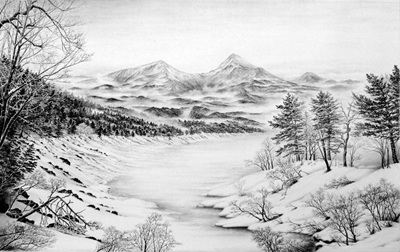 「氷湖春待」 平成24年(2012年) P50(116.7cm×80.3cm) 3月末の裏磐梯・水面が下がり、全面氷結の桧原湖の薄くなった周囲の氷に春雪が積もり、朝はまだまだ寒い。 しかし、周辺の木々は、春を待つように芽吹き始めている。 雪解けが進む磐梯山も朝日に赤く染まって、神神しい。 第29回墨神会水墨画全国公募展 無鑑査 |