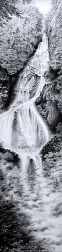 「仙界涼気」 平成24年(2012年) 掛軸(135.0cm×35.0cm) 昨年に描いた「仙界爽気」層雲峡・流星の滝である。 今年はその左にある「銀河の滝」を描いたものである。 濃い朝靄に消える滝壺からの轟音が、谷間に響く。 若葉の薫る時期は、水量も多いが、意外と静かで鳥の声も聞こえる。 静寂な森から酸素の多い涼気が湧いて、すがすがしい。 絶壁の谷間の空間に薄い涼気の漂いを感じて戴ければ幸いです。 第40回記念 全日本水墨画秀作展 経済産業大臣賞 受賞 |