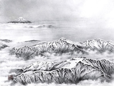 「名峰四岳」 平成25年(2013年) F10(53.0cm×45.5cm) 「富士山」 「北岳」 「間ノ岳」 「仙丈ヶ岳」 中央アルプス側からの眺望、遠くに伊豆の山々がかすんで見える。 薄点からだんだんと濃い点で、全て小筆による点で描いてみた。 |