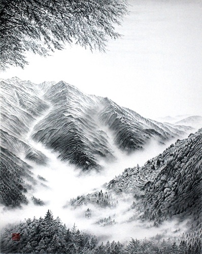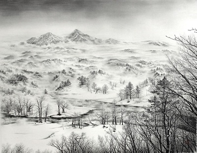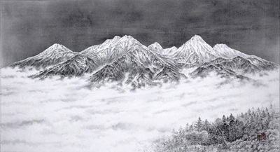 「神秘で謎の山 八ヶ岳連峰」 (中央高速須玉から) 平成26年(2014年) 半切1/2(35cm×67.5cm) 長野県諏訪地域・佐久地域と山梨県にまたがる 山塊。 赤岳、横岳といった八ヶ岳の主峰部分から蓼科山まで南北30km余りの山体で、 大火山群である。 薄点からだんだんと濃い点で、全て小筆による点で描いてみた。 (神話) 八ヶ岳には「富士山と背比べをして勝利、しかし富士山に蹴り飛ばされて八つの峰になった」という神話がある(「蹴り飛ばされた」の部分はその他にも説がある。 例えば、背比べの際に用いた筒、すなわち富士山と八ヶ岳との間にかけて水を流し、どちらに流れるかを調べるのに用いた筒を持って富士山が八ヶ岳を叩いたなど)。 また、同神話では蓼科山は八ヶ岳の妹で、八つの峰になった八ヶ岳を見て泣いて、それが川になり溜まったのが諏訪湖とされている。 |