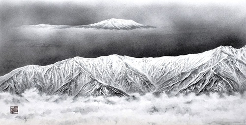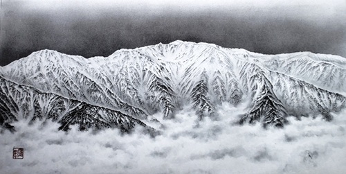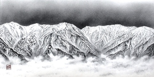 | 「中央アルプス連峰」 陣馬形山から 平成26年(2014年) 半切1/2(35cm×67.5cm) 3枚 薄点からだんだんと濃い点で、全て小筆による点で描いてみた。 |