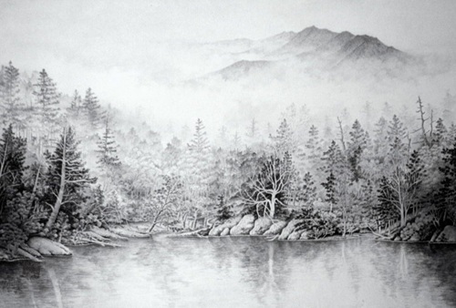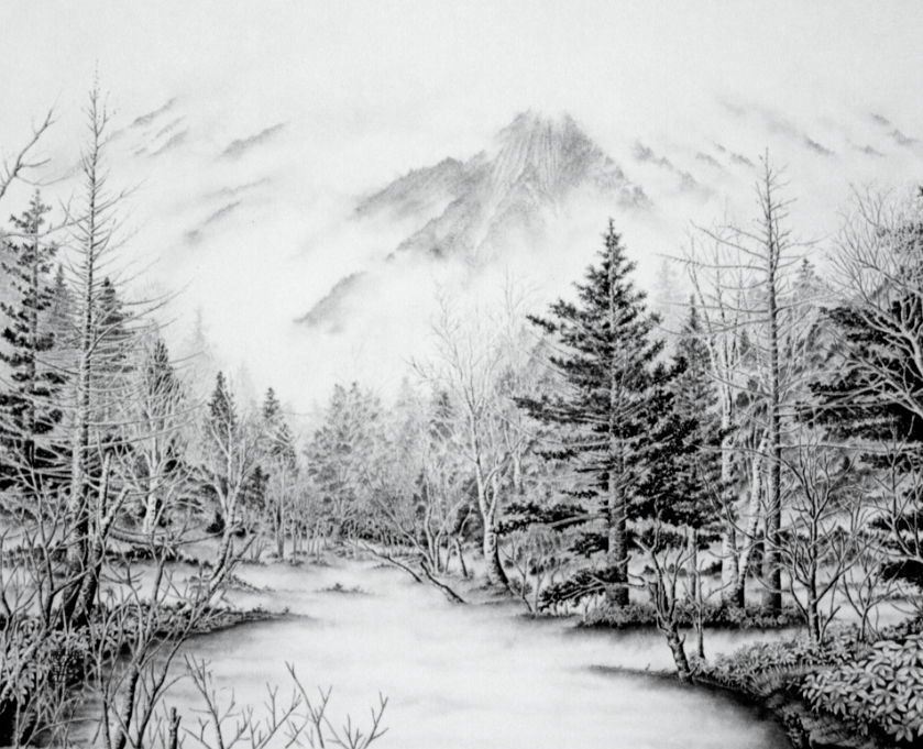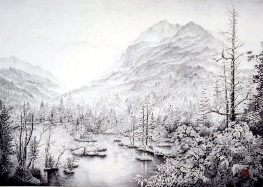 朝霧冷気平成9年(1997年) F20号(72.7cm×53.0cm) 上高地,河童橋から明神池に向かって,5分程度歩いたところですが,この日は小雨上がりの霧が上がっていくところで,絶好の機会…と西糸屋山荘を早朝に出ました。 ここも丁度,早朝の冷気で水面は薄い靄が立ち,向かいの山は霧が上がり始め,静寂な中に鳥の鳴き声が響き渡り,寒かったがなかなか見られない景色だった。 この後,明神池に行く途中の森の中で,道の両側の柵の上にいる7〜8匹の猿の家族と出くわして,目を合わせないように周りの景色を見ながら,知らぬ振りをして怖々と妻と二人で通り抜けました。 熊よけの鈴は,ぶらさげていましたが,やはり早朝は危険が多い。 第十四回鳳墨会水墨画展(平成9年10月) 芸術新聞社賞 |