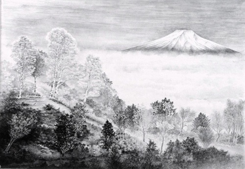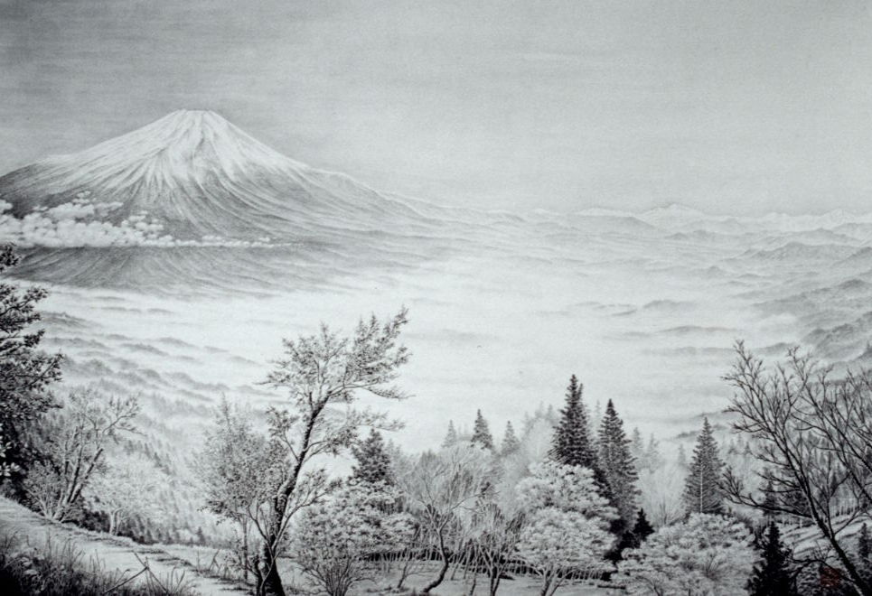 峠の穏景平成11年 (1999年) P50号 (116.7cm×80.3cm) 始めての50号,最初はやはり雄大な富士山を描こうと挑戦しました。この絵は,忍野の東の七曲峠からの春の早朝の景色です。 遠くには南アルプスの雪の山々が見え,あの向こうが信州伊那谷,故郷です。 手前の盆地が,お花畑や忍野村で,朝日が昇り,海からこの日一番の雲がいつの間にか出てきていました。 次の富士は,画面一杯に富士山と雲を描こうと思っています。 第7回神奈川県水墨画公募展(平成12年) 奨励賞 |