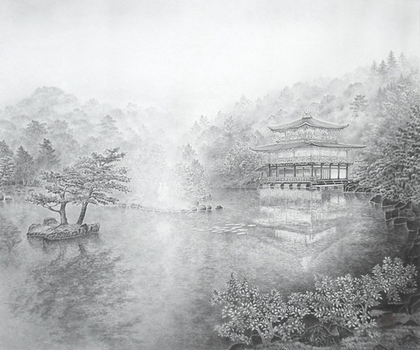 そこで、修学旅行や課の旅行や水墨画の友人達との旅等で、何度も訪れ、一度描いてみようと思っていた金閣寺を描いてみました。 中央に、現在もまたこれからも世界遺産として残る金閣寺を見つめる義満を幻として、描いてみました。